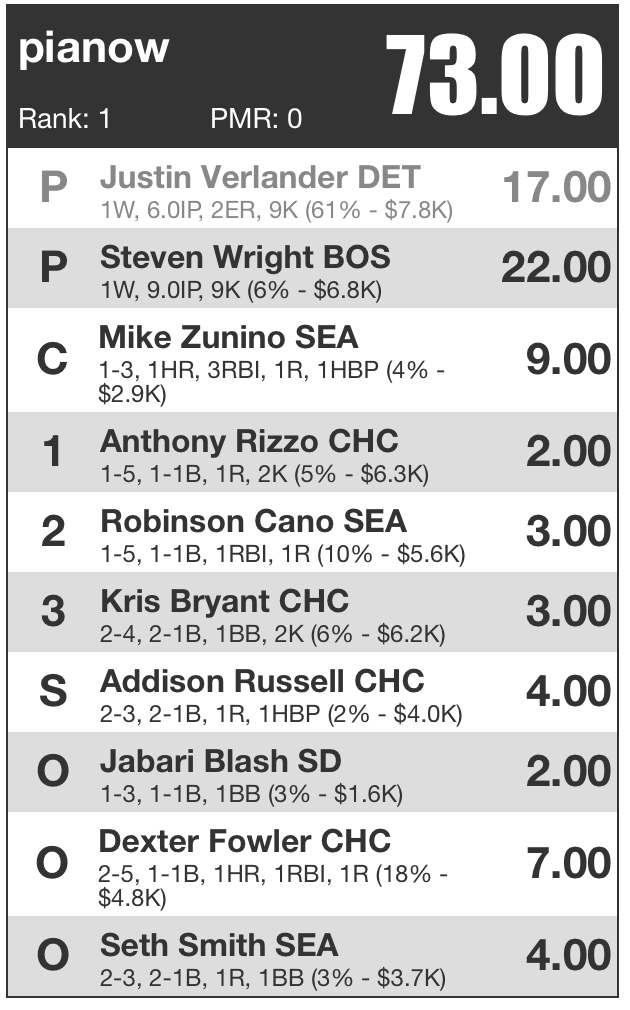 He did it by rostering the day’s big pitchers, Stephen Wright, who was owned by just six-percent of teams, and a resurgent Justin Verlander, who was owned by a resounding 61 percent. The two combined for 39 points.